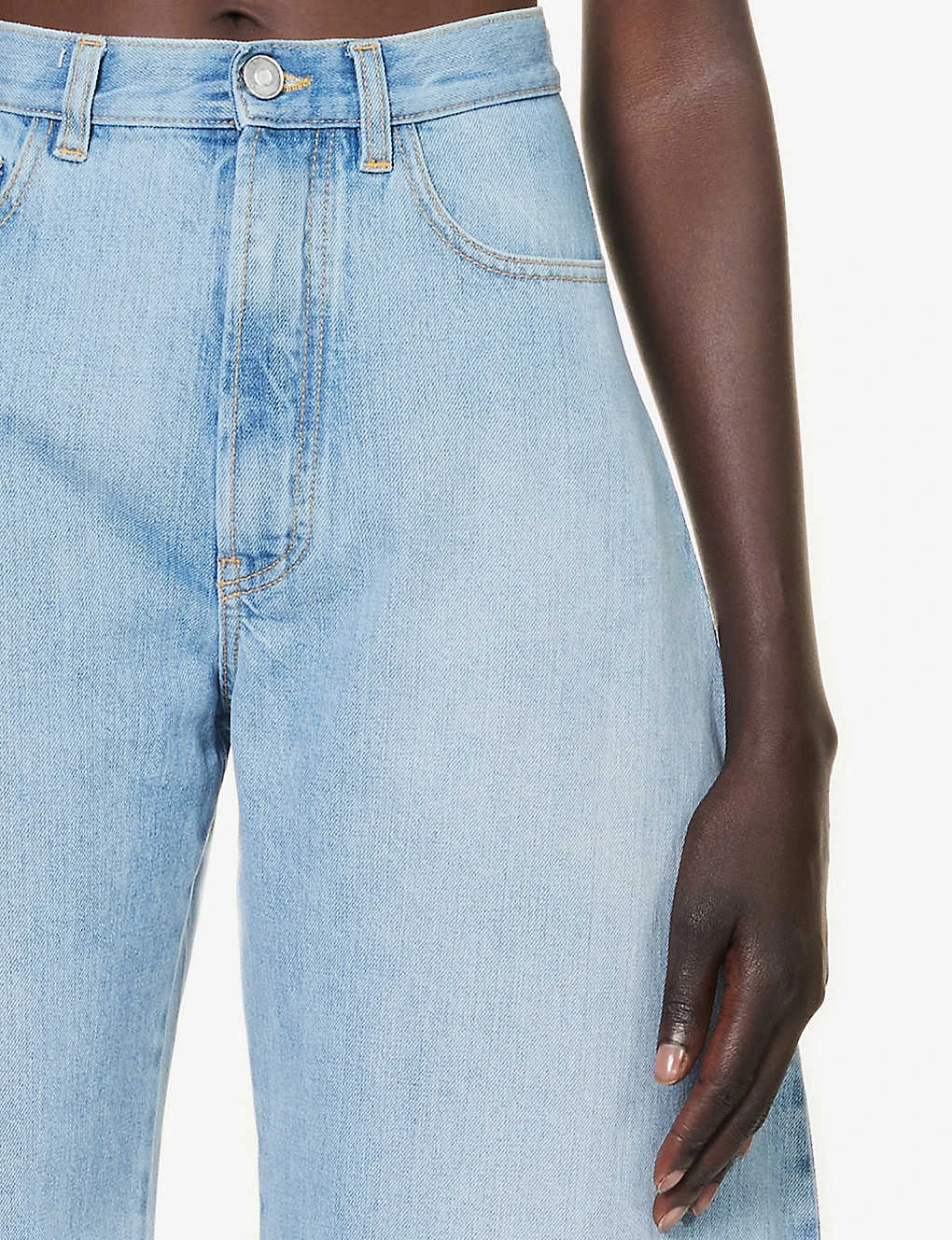 - Regular fit, mid-rise, barrel leg, structured waistband with belt loops, five pockets, faded wash, contrast stitching, branded hardware