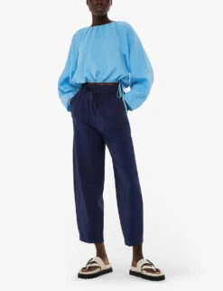 - Regular fit, mid-rise, straight leg, structured waistband with belt loops, two slip pockets at front, darts at back, welt pocket at back, pressed centre creases, zip at hems
