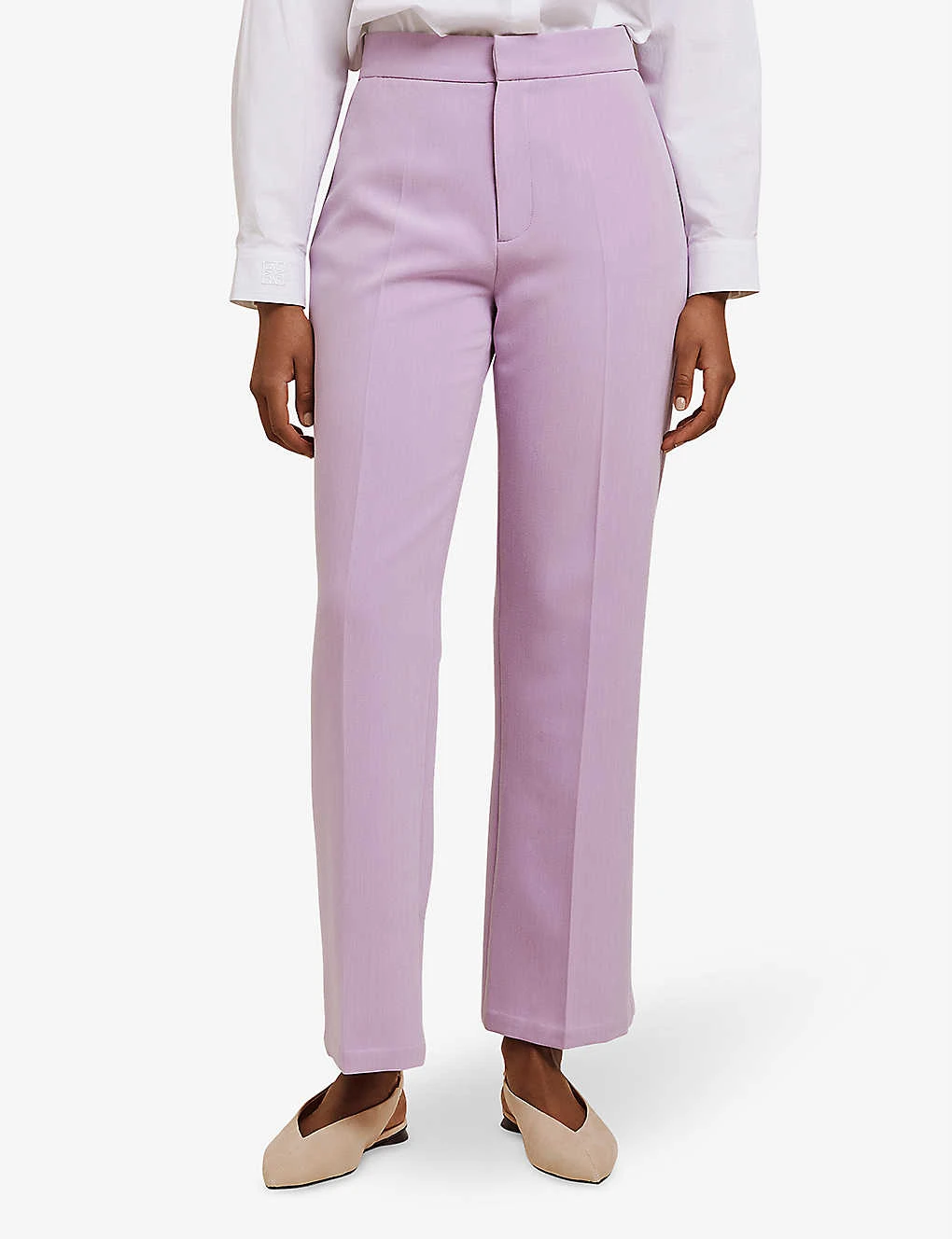 - Slim-fit, high-rise, straight-leg, structured waistband, pressed centre crease, pocket detailing at back