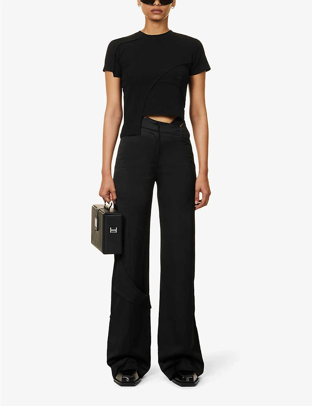 - Regular fit, round neck, ribbed trim at neck, brand print at front, deconstructed panelled pattern, cropped, asymmetric hem