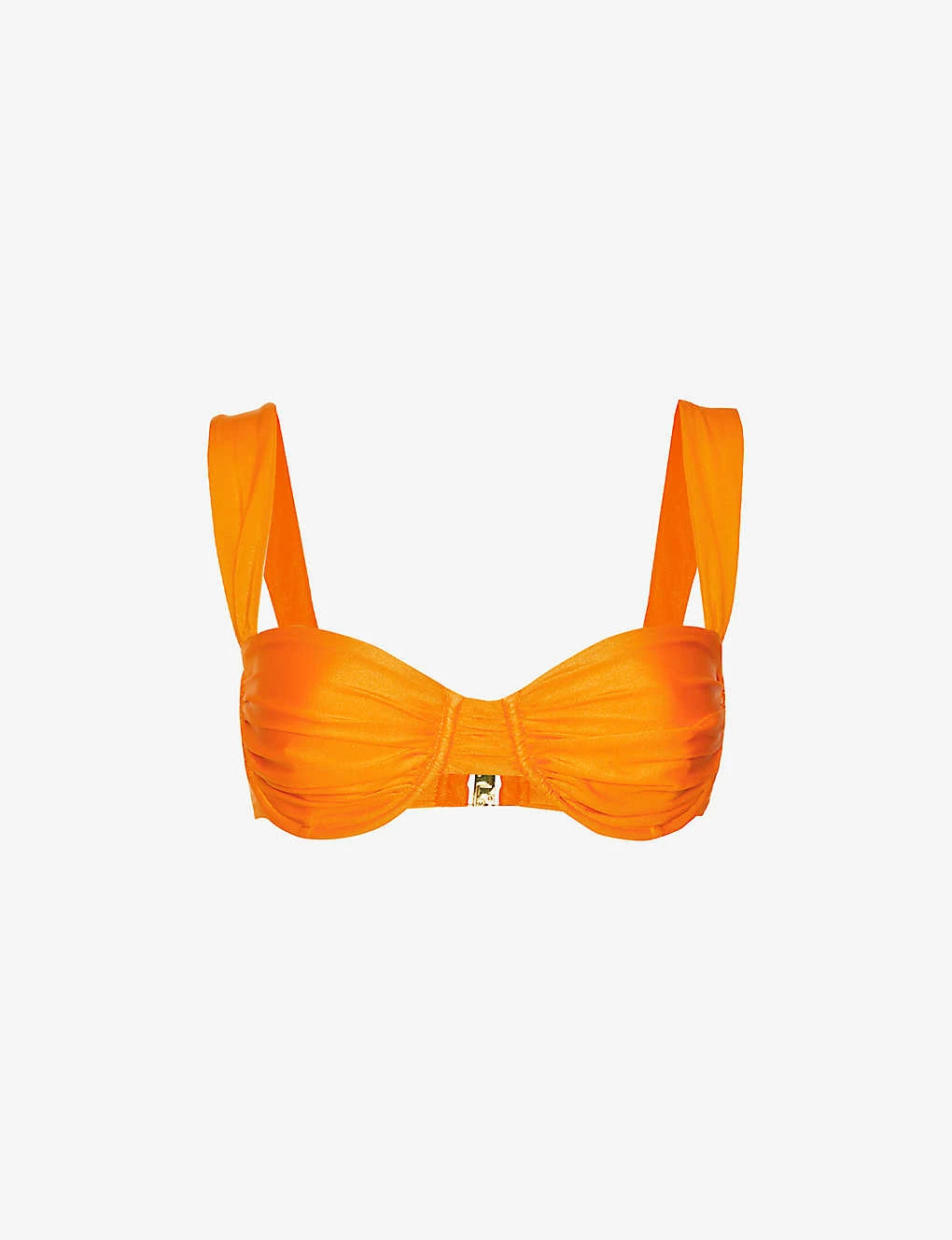 - Regular-fit, V-neck, adjustable shoulder straps, soft moulded cups with underwiring, all-over ruching, gold-toned hardware