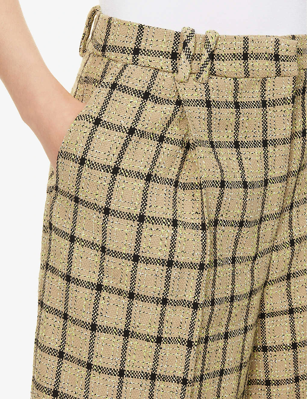 - Regular fit, mid-rise, structured waistband with belt loops, pleats at front, two slip pockets at front, angled welt pocket at back, all-over check pattern