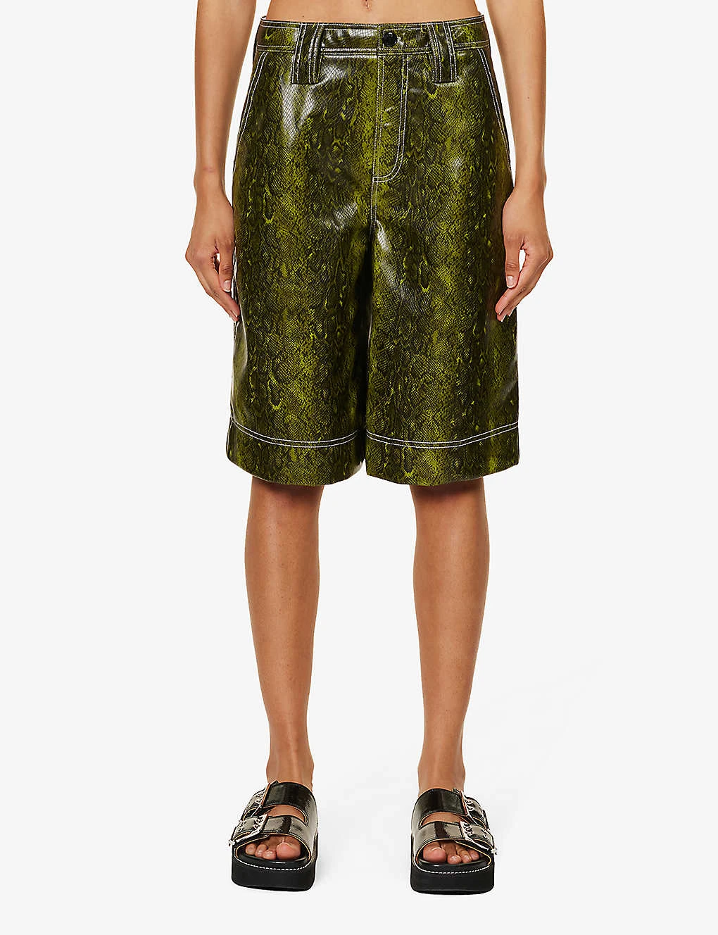 Ganni Snake-print Wide-leg Faux-leather Shorts