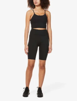 - Triangle cups, halter self-tie, tonal brand text print at front, open strappy back