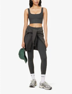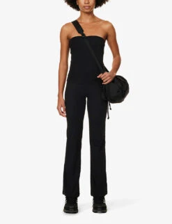 - High rise, elasticated waistband, high leg, tonal brand text print at front