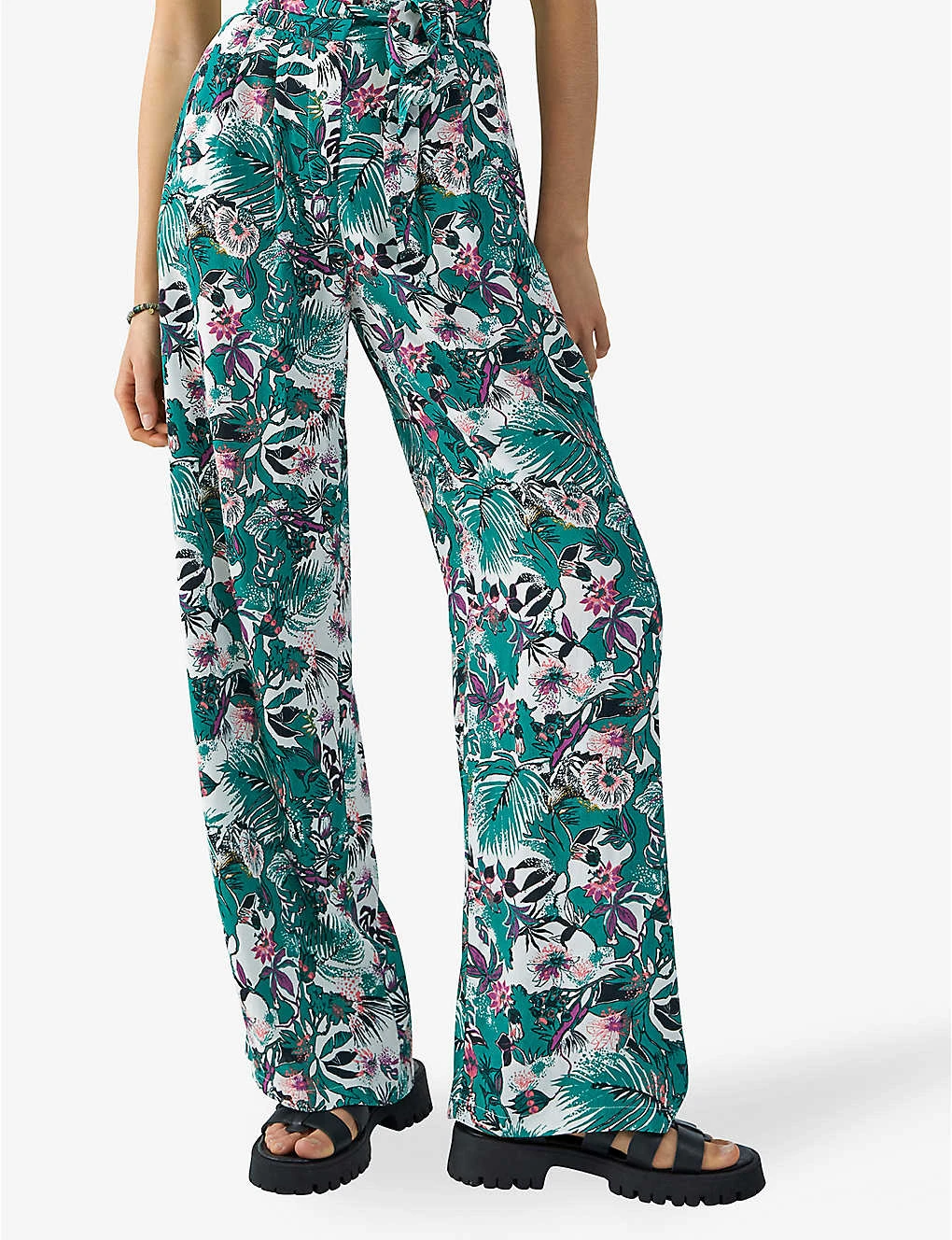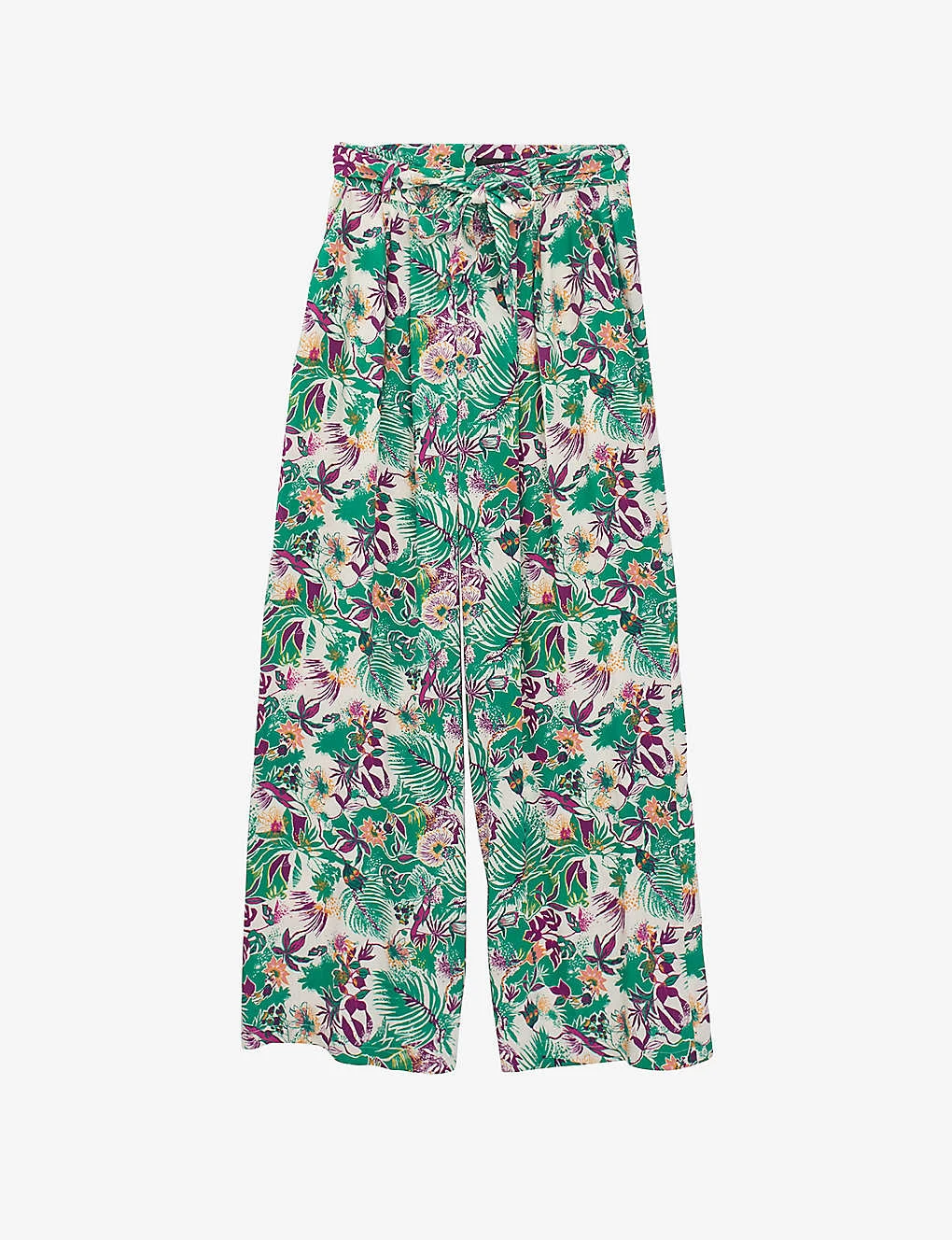 - Structured waistband, high rise, wide leg, all-over botanical print, belt loops, detachable self-tie fastening, two side slip pockets, pleats at front, darts at back