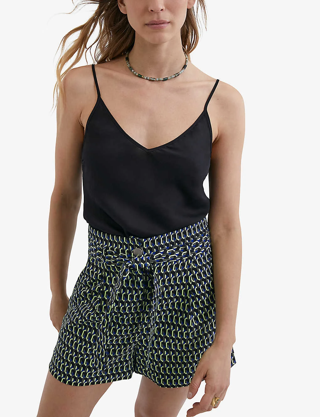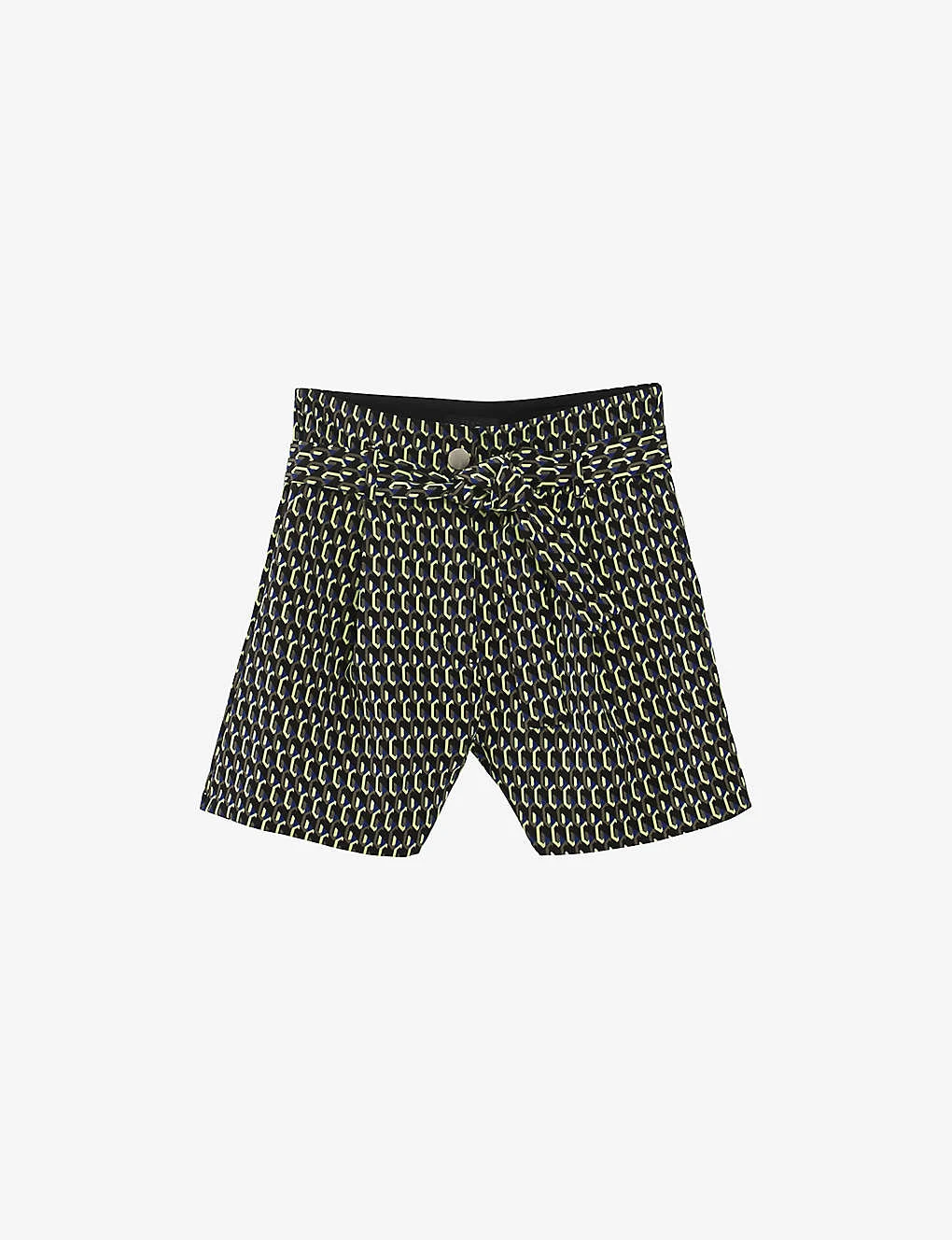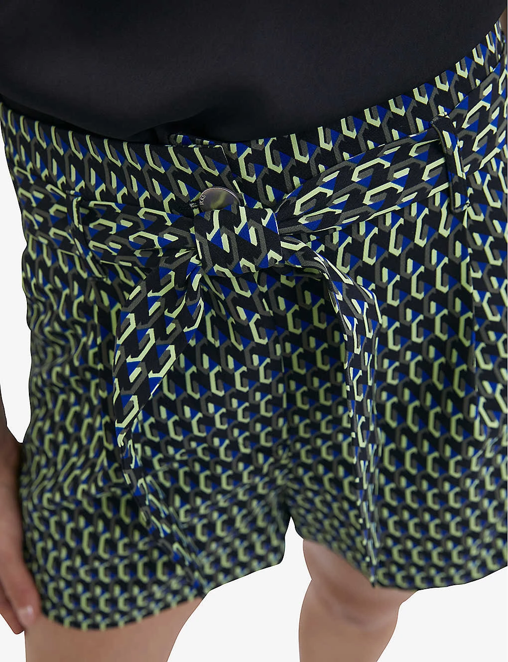 - Structured waistband, branded button fastening at front, belt-loops, detachable self-tie fastening belt, two slip pockets either side, all-over graphic print
