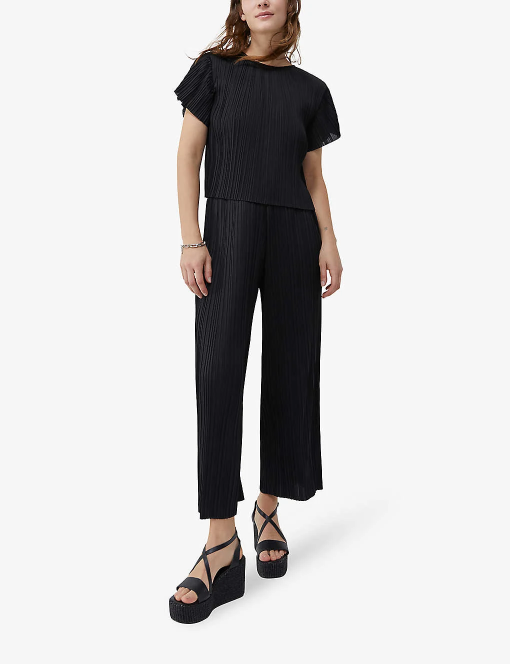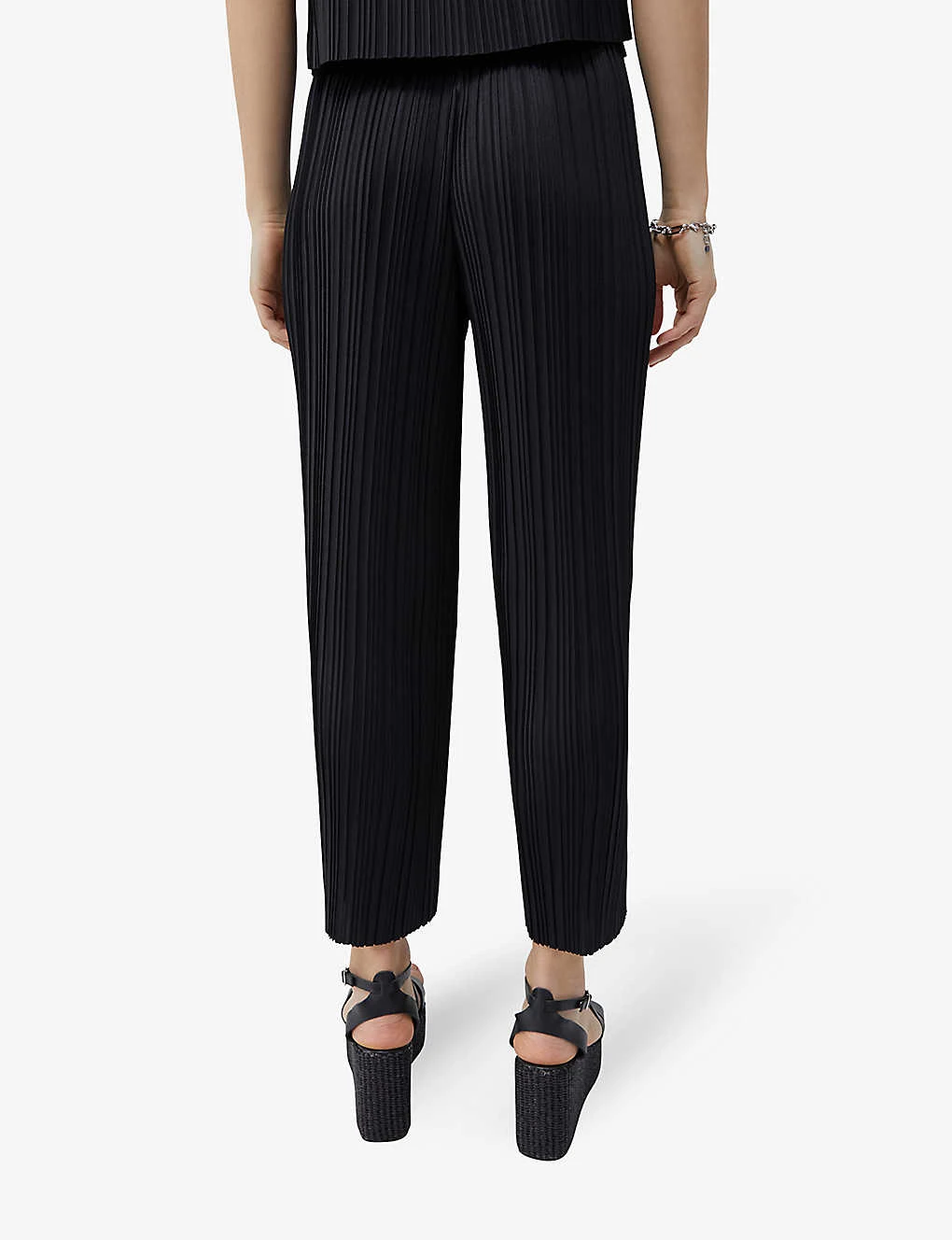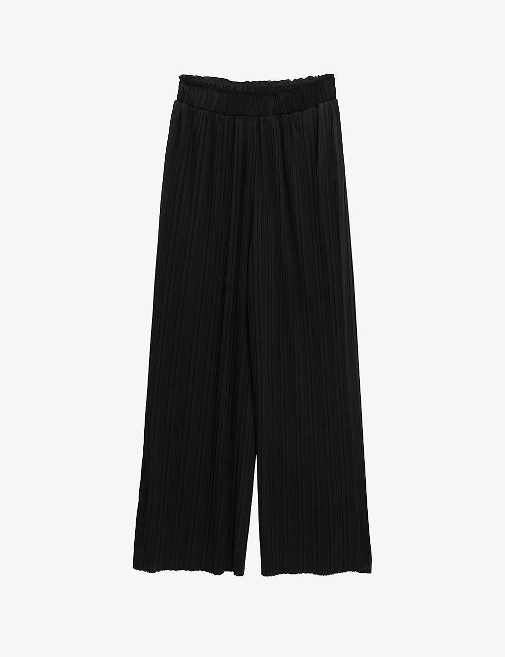 - Wide leg, high rise, elasticated waist, two slip pockets at sides, all-over pleated fabrication