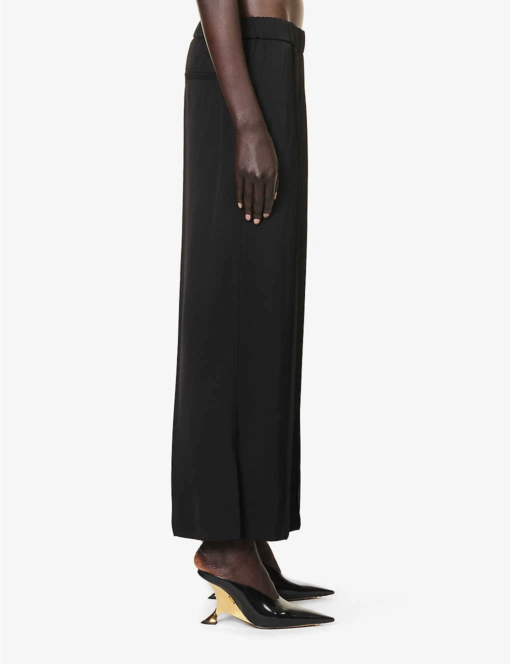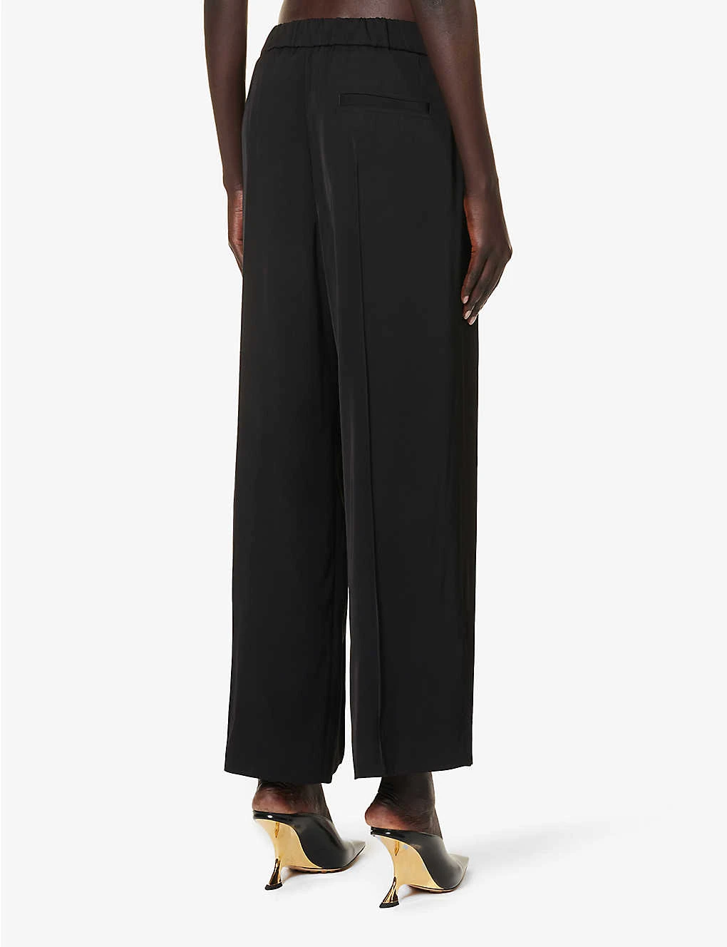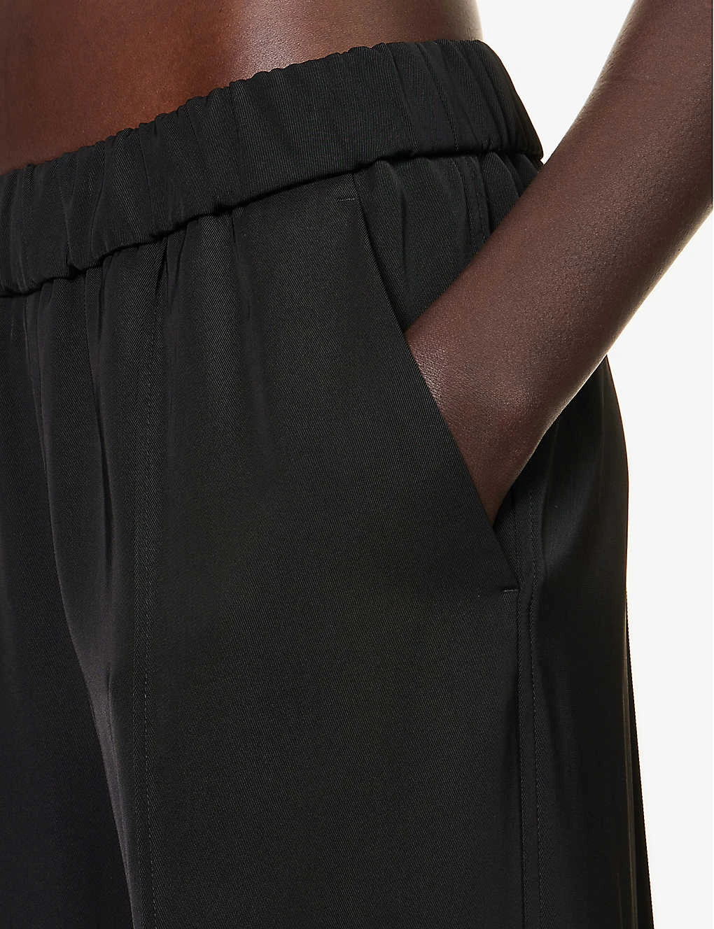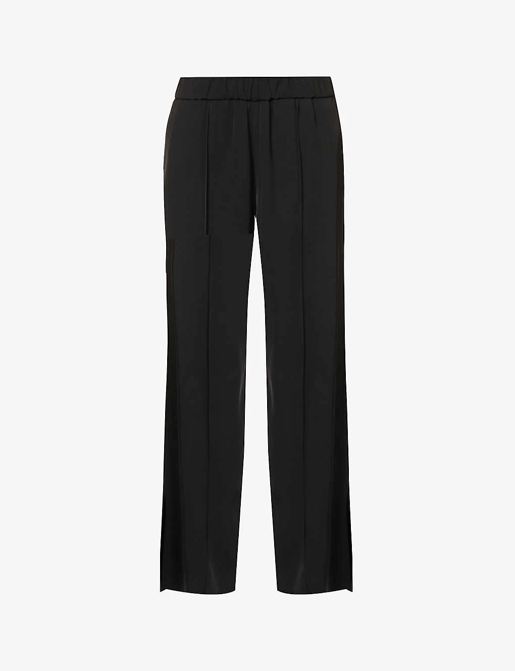 - Relaxed fit, mid-rise, wide leg, elasticated waistband, two slip pockets at front, welt pocket at back, stitched centre creases, split hems