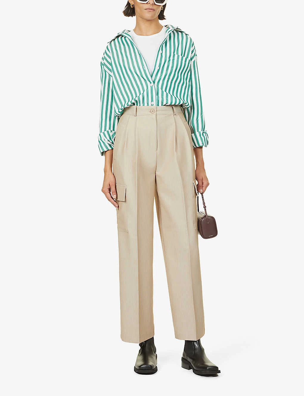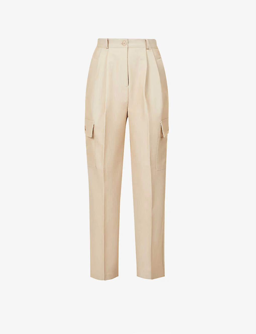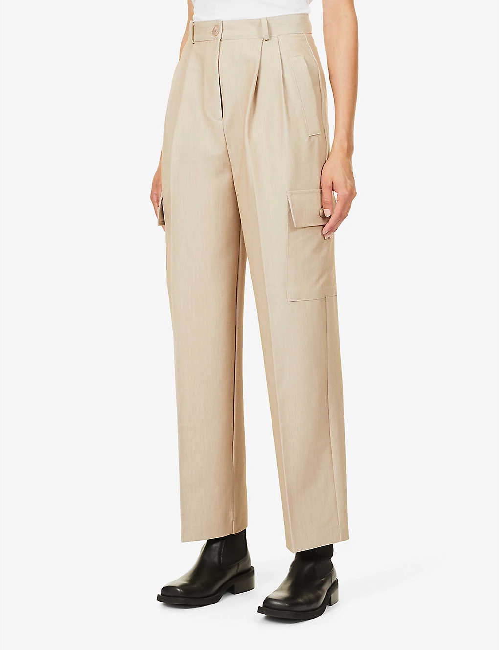 - Relaxed fit, high rise, straight leg, belt loops, dual knife pleats at sides, two slip pockets at sides, pressed centre pleats at front and back, two flap pockets at front, darts at back, two welt pockets at back, partially lined