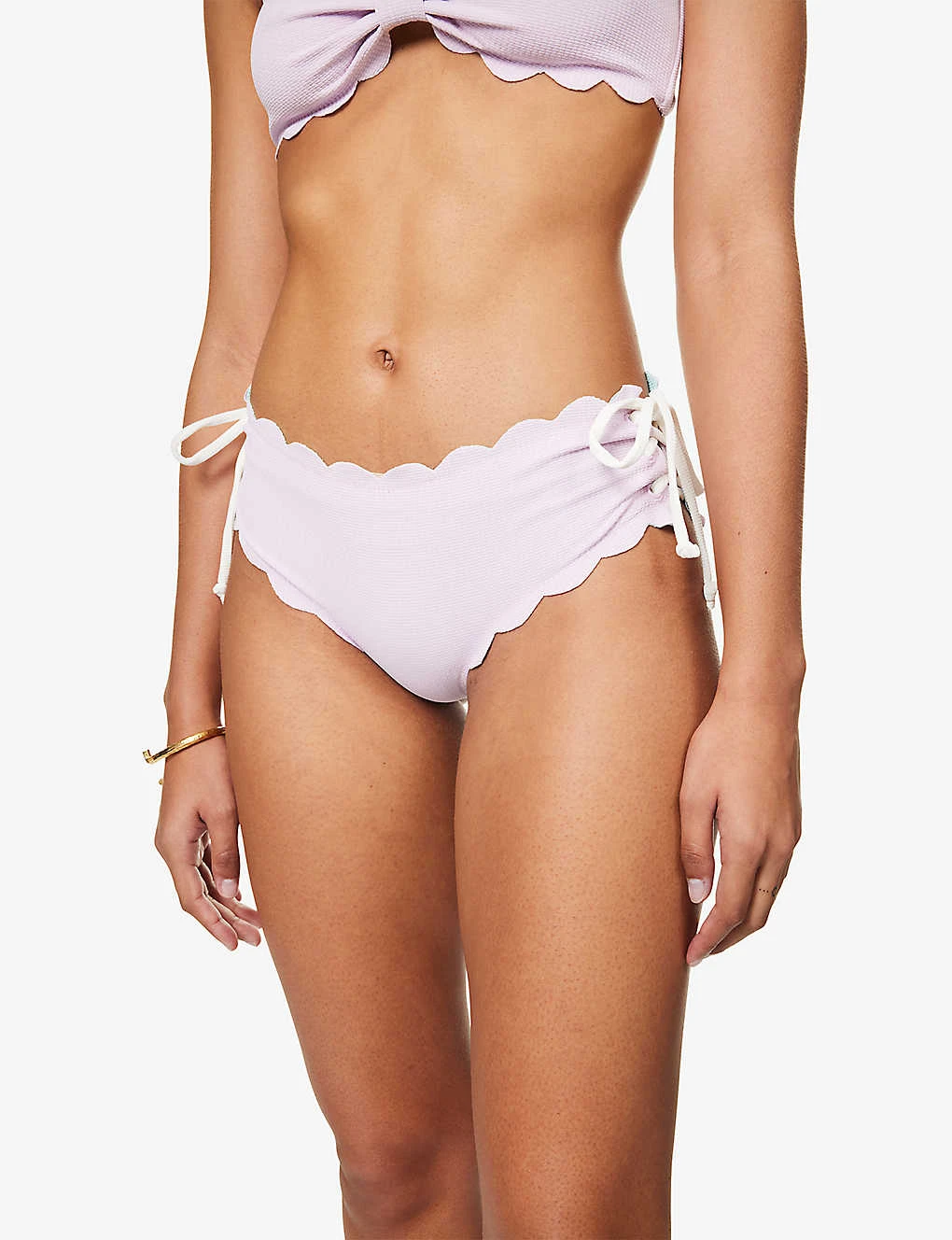 - Mid-rise, high leg, textured, scallop trims