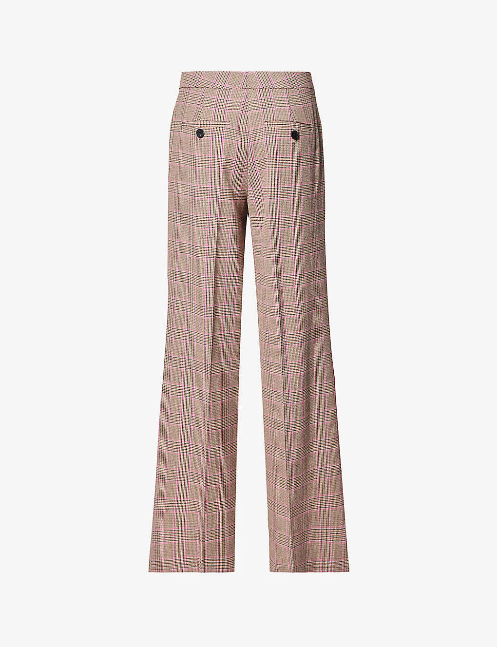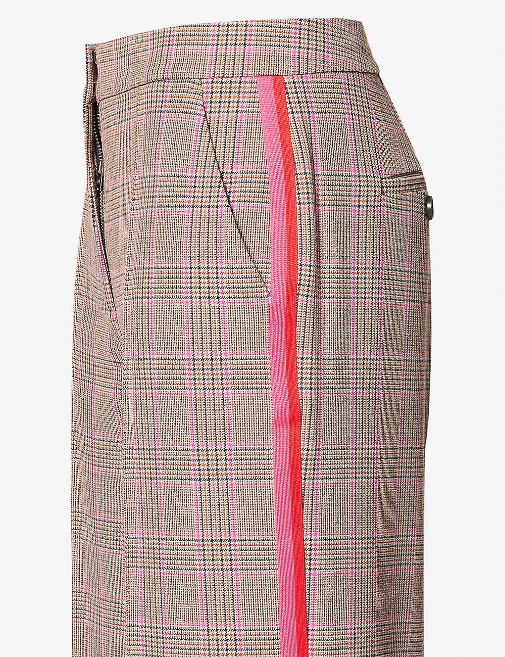 - Regular fit, mid-rise, straight leg, two slip pockets at front, two buttoned welt pockets at back, pressed travel creases at front and back, all-over check pattern, stripe panels at sides, splits at cuffs