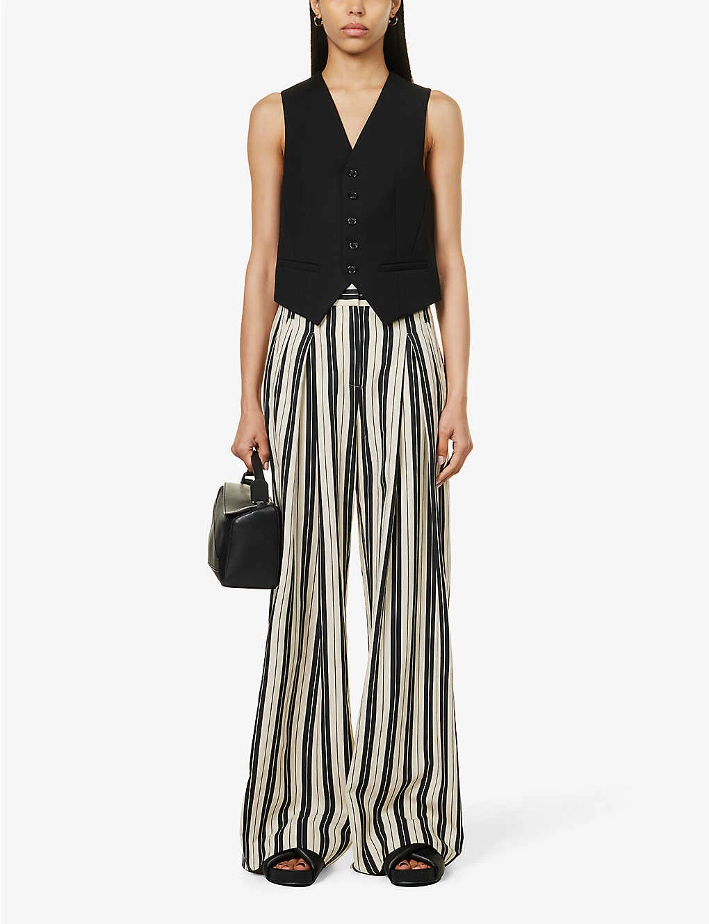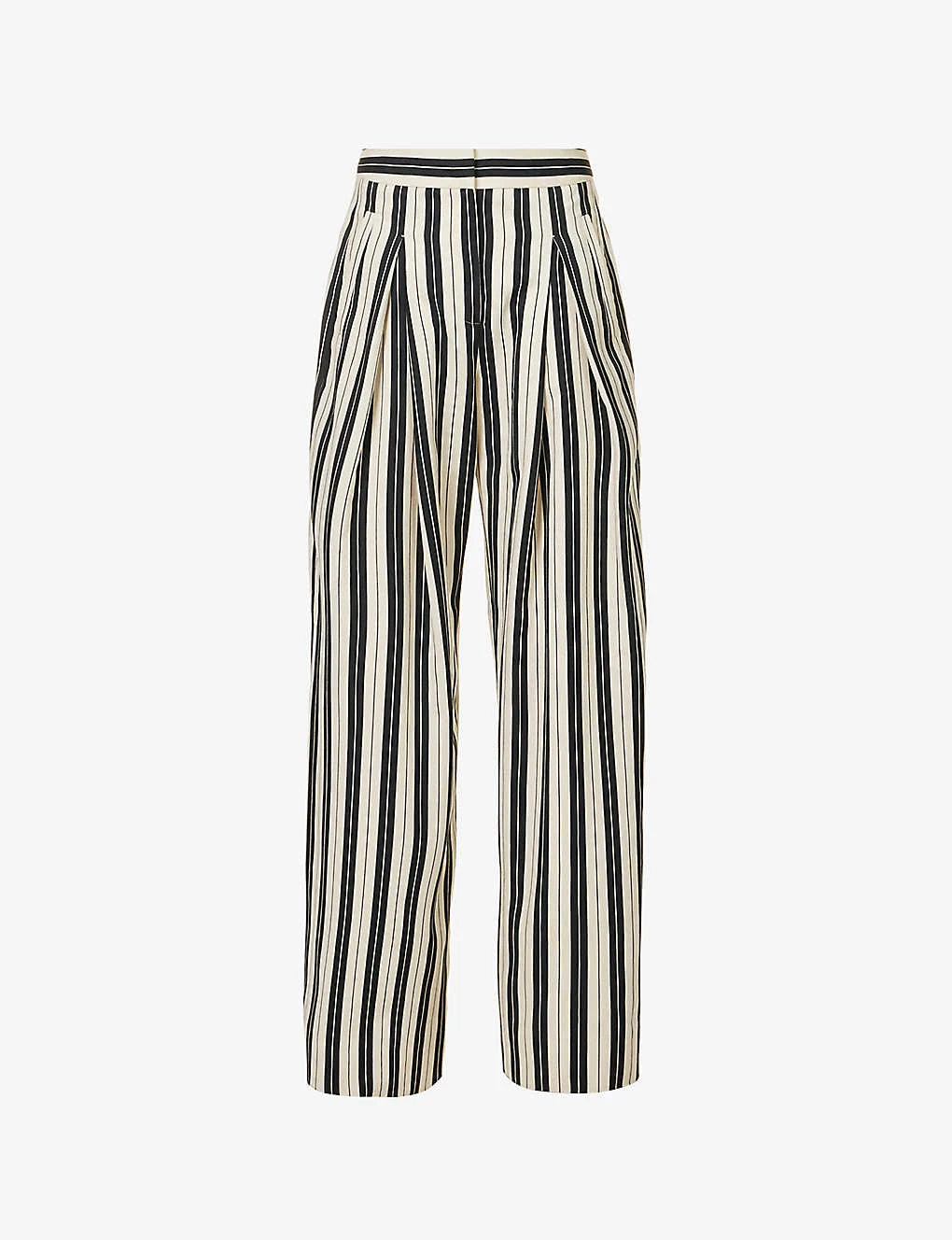 - Regular fit, high rise, wide leg, structured waistband, two angled slip pockets at front, pleats at front, darts at back, two welt pockets at back, all-over stripe pattern, zig-zag woven texture