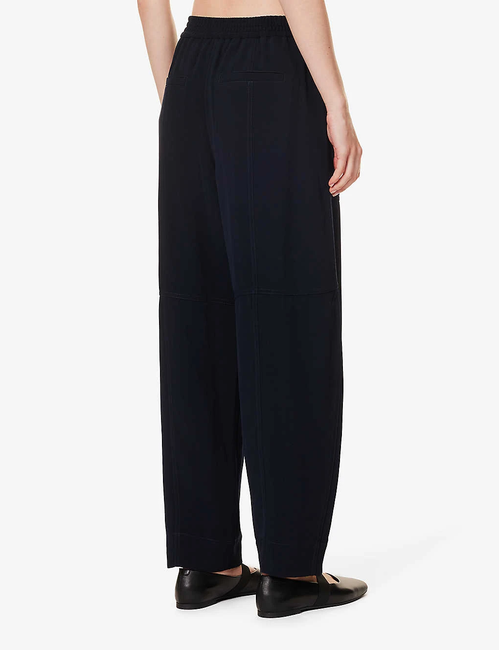 - Relaxed fit, mid-rise, tapered leg, elasticated waistband, two slip pockets at front, two welt pockets at back, contrast stitching, panelled pattern, twill texture