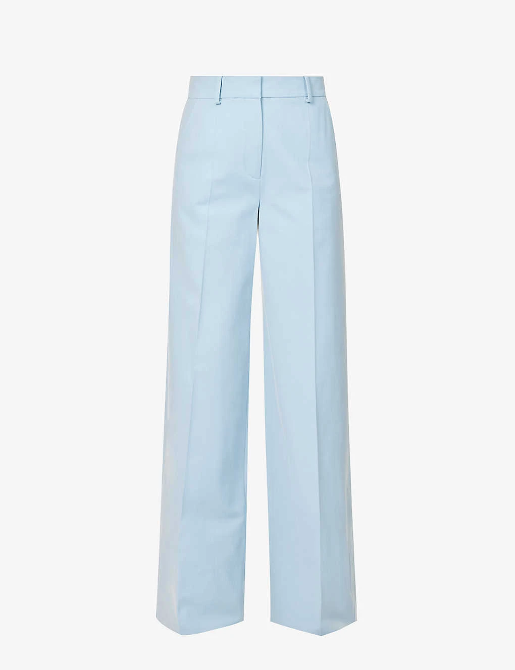 - Regular fit, mid-rise, wide leg, belt loops, two slip pockets at front, pressed centre creases, darts at back, two buttoned welt pockets at back, split at sides