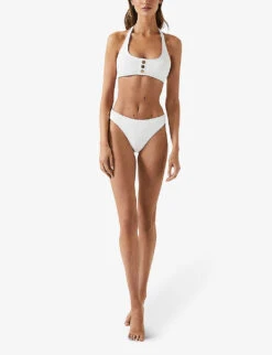 - Plunging neckline, triangle cups, shoulder straps, crossover design at back, contrast stitching, all-over contrast zig-zag overlay, medium coverage at back, fully lined