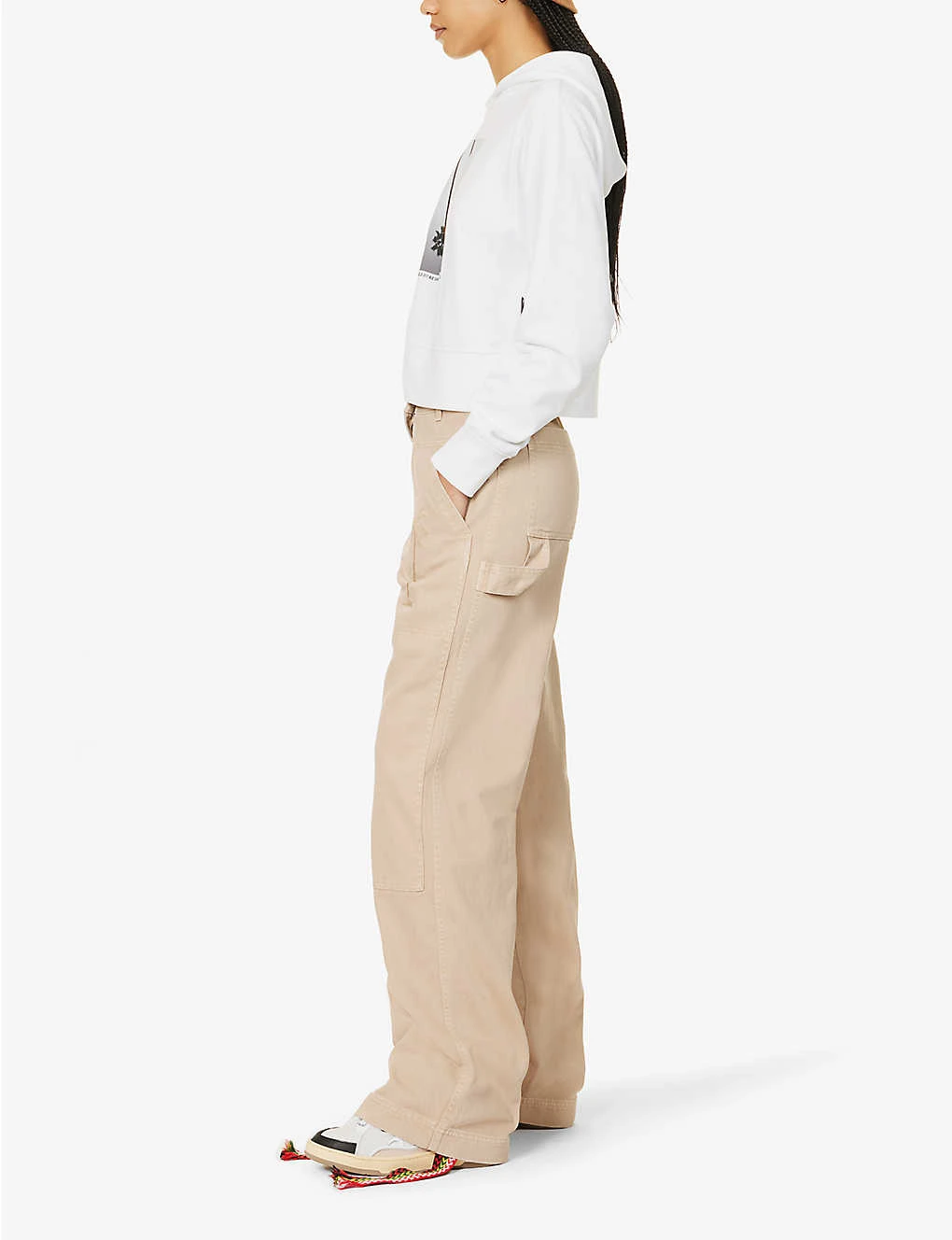 - Regular fit, mid-rise, wide leg, belt loops, two slip pockets at front, embroidery at front, two patch pockets at back, hammer loop at back, brand tab at back, branded hardware