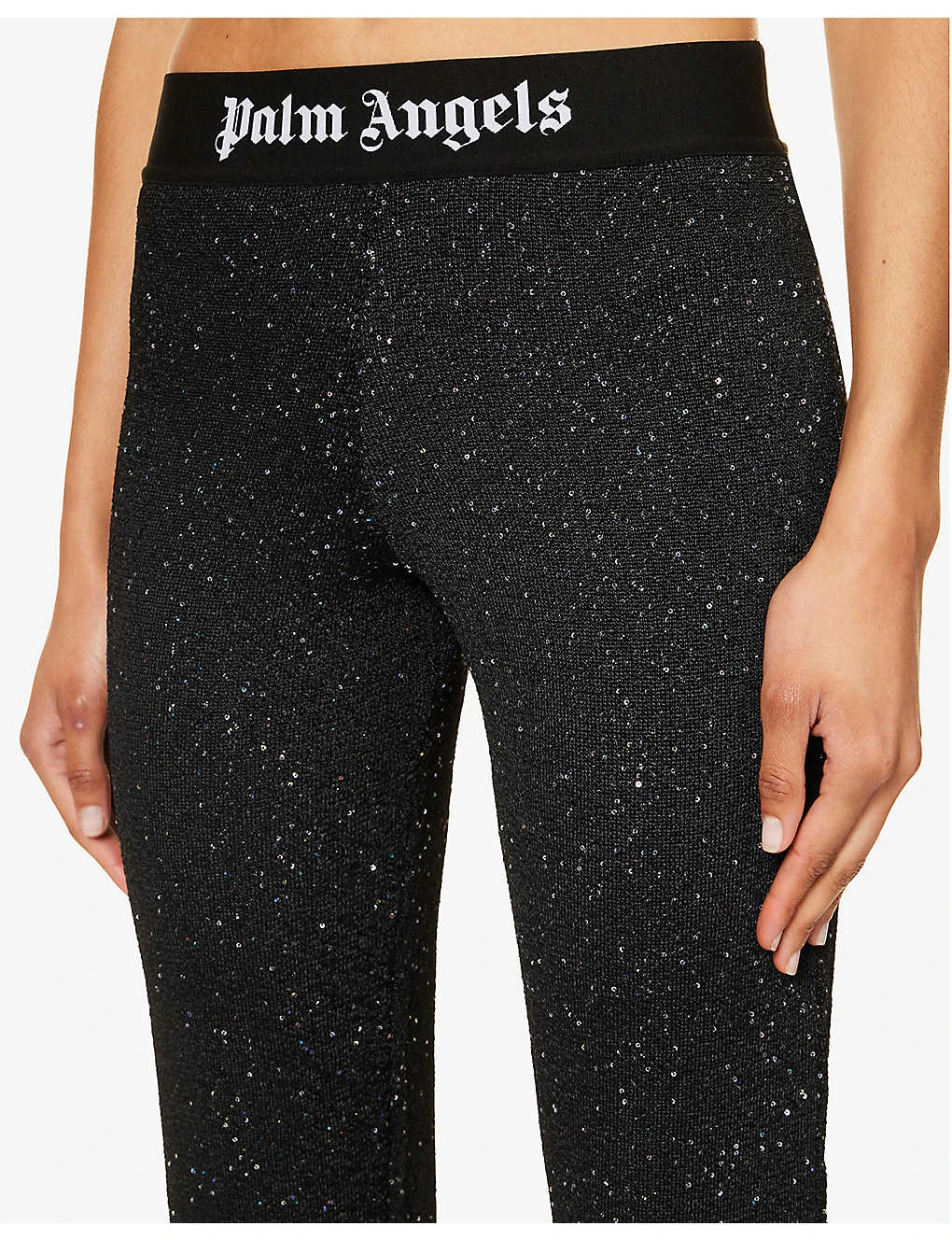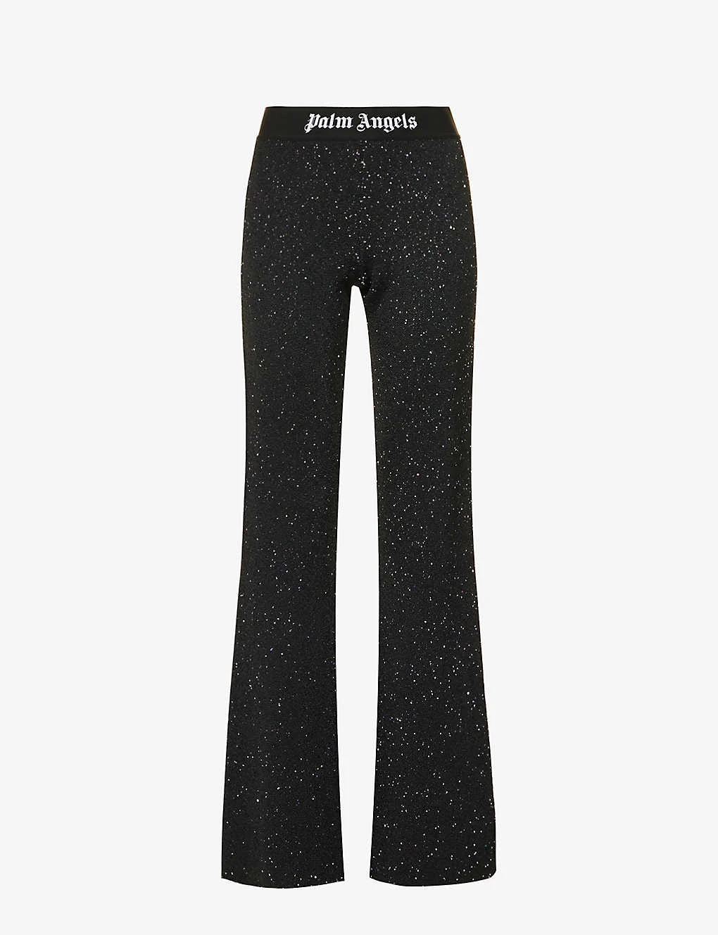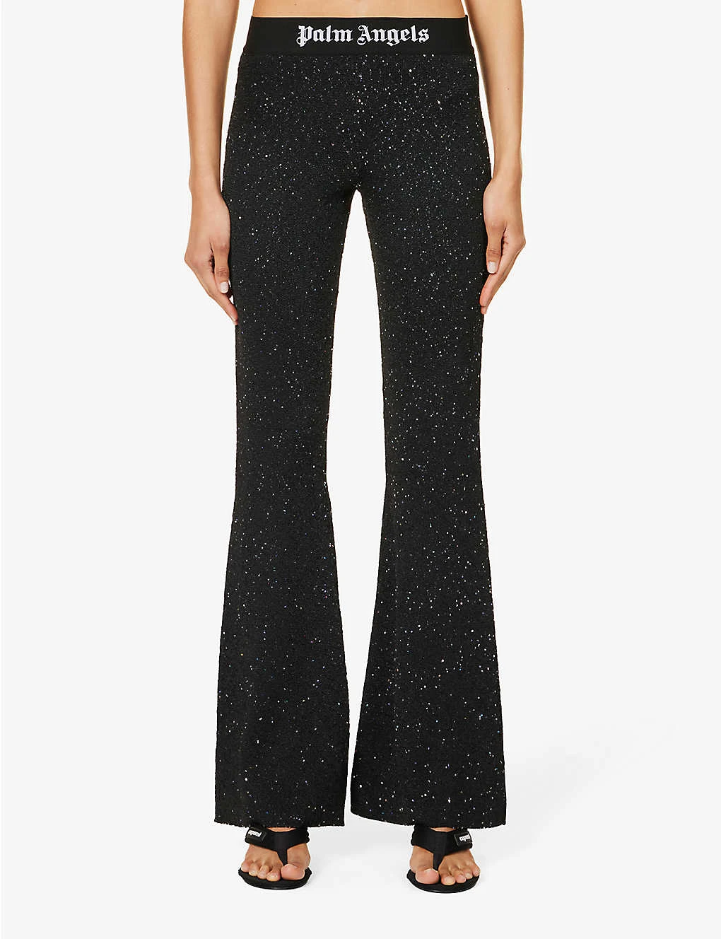 - Regular fit, mid-rise, flared leg, branded elasticated waistband, all-over sequin embellishments