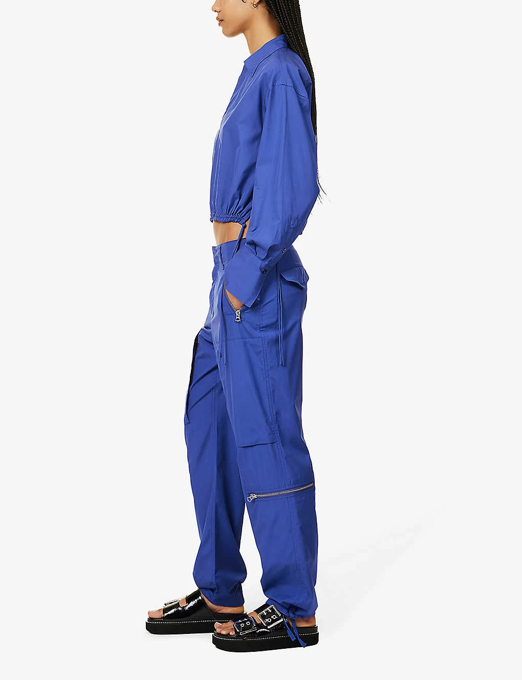 - Regular fit, mid-rise, straight leg, adjustable tabs at sides, belt loops, six zipped slip pockets at front, two flap pockets at back, adjustable cuffs