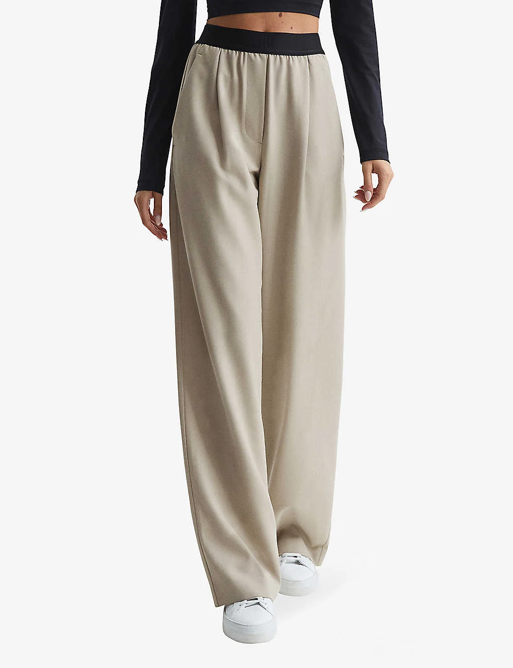 - High-rise, wide leg, elasticated contrast waistband, two slip pockets, high pleats