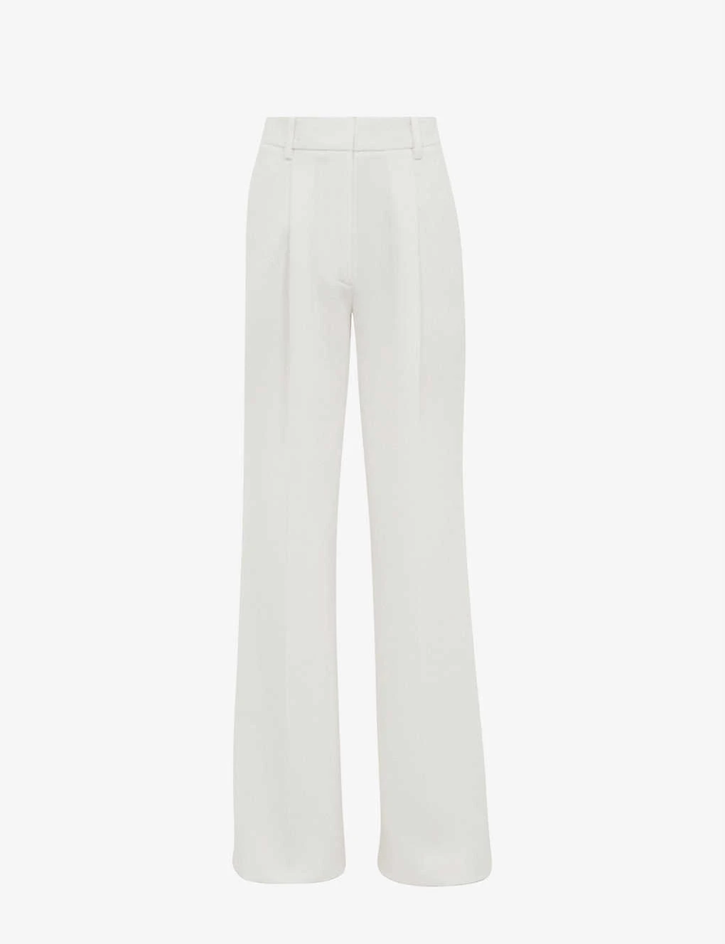 - High rise, belt loops, pleat detail at the waist, pressed creases to the front, slip pockets at the hips, wide leg