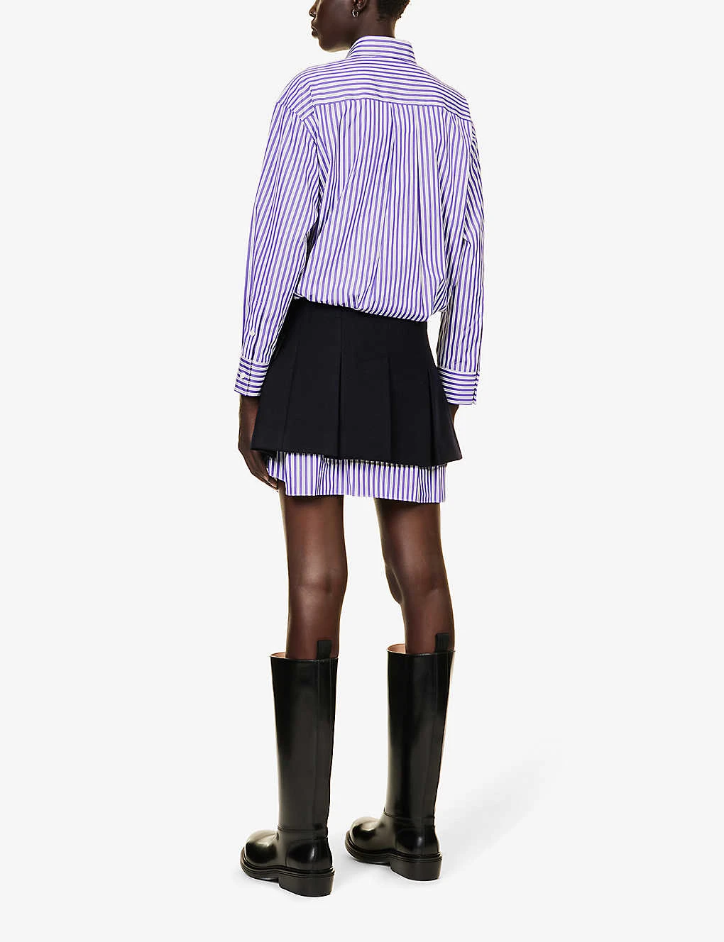 - Regular fit, collar, long sleeves, pleated cuffs, patch pocket at chest, box pleat at back, branded pearlescent buttons, all-over striped pattern, contrast pleated mini skirt overlay, two flap pockets at overlay, partially lined
