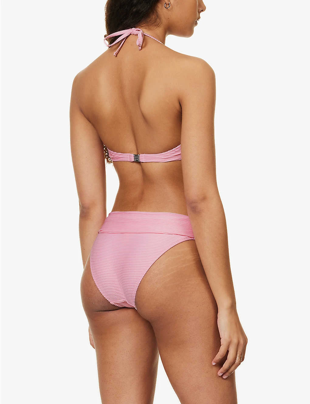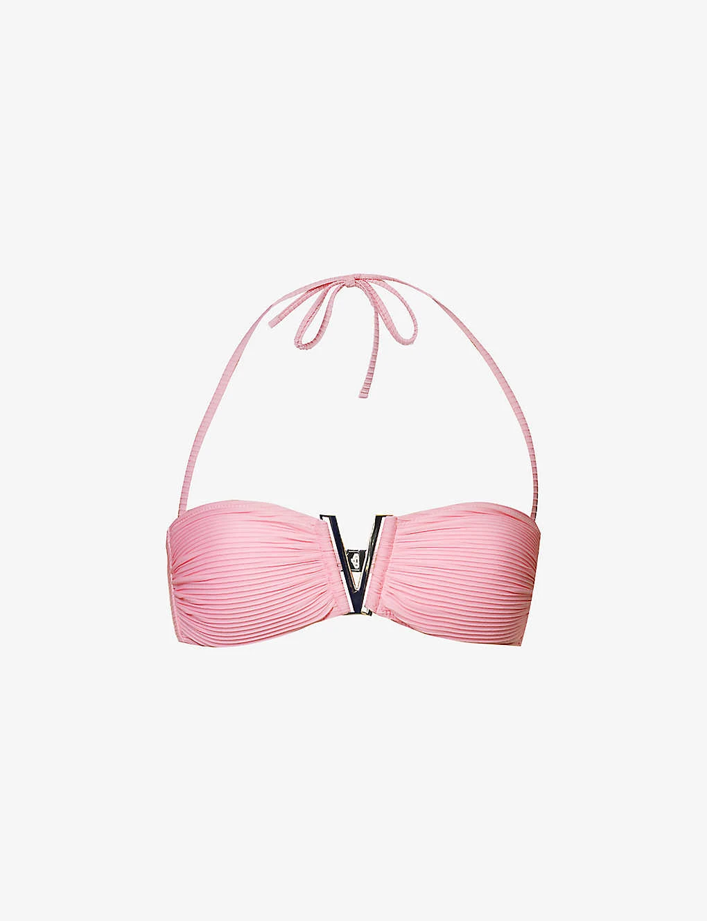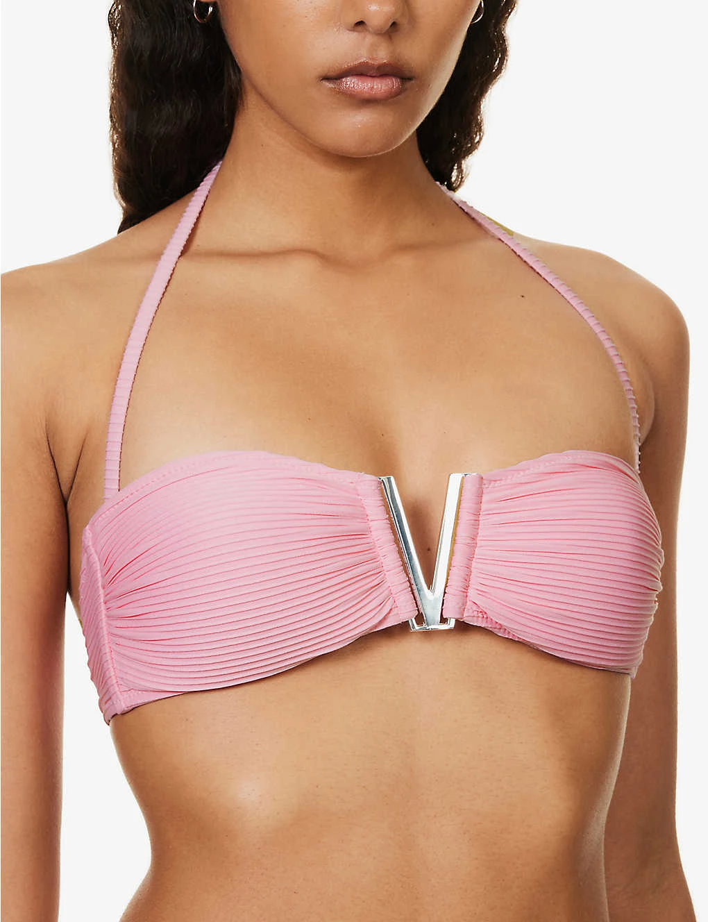 - Sweetheart neck, detachable shoulder straps, rounded cups, detachable padding, silver-toned hardware, plaque at front, partially lined