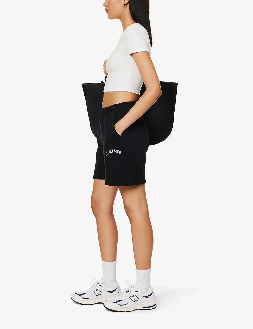 - Relaxed fit., high rise, elasticated drawstring waistband, two slip pockets at sides, brand print at front, patch pocket at back, partially lined