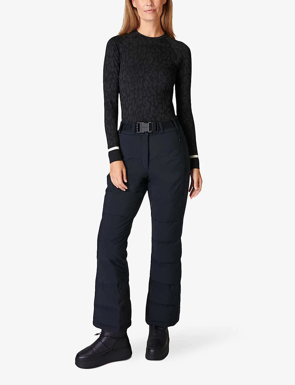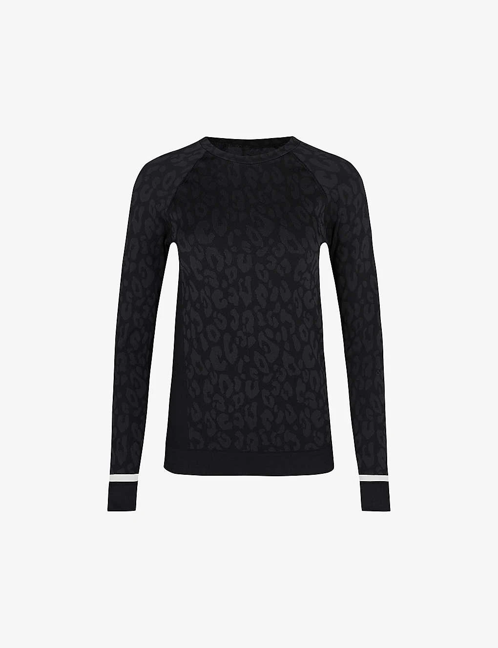 - Round neck, long sleeves, contrasting stripe cuffs, fitted, all-over leopard jacquard pattern, sweat-wicking, anti-bacterial finish, breathable, seamless