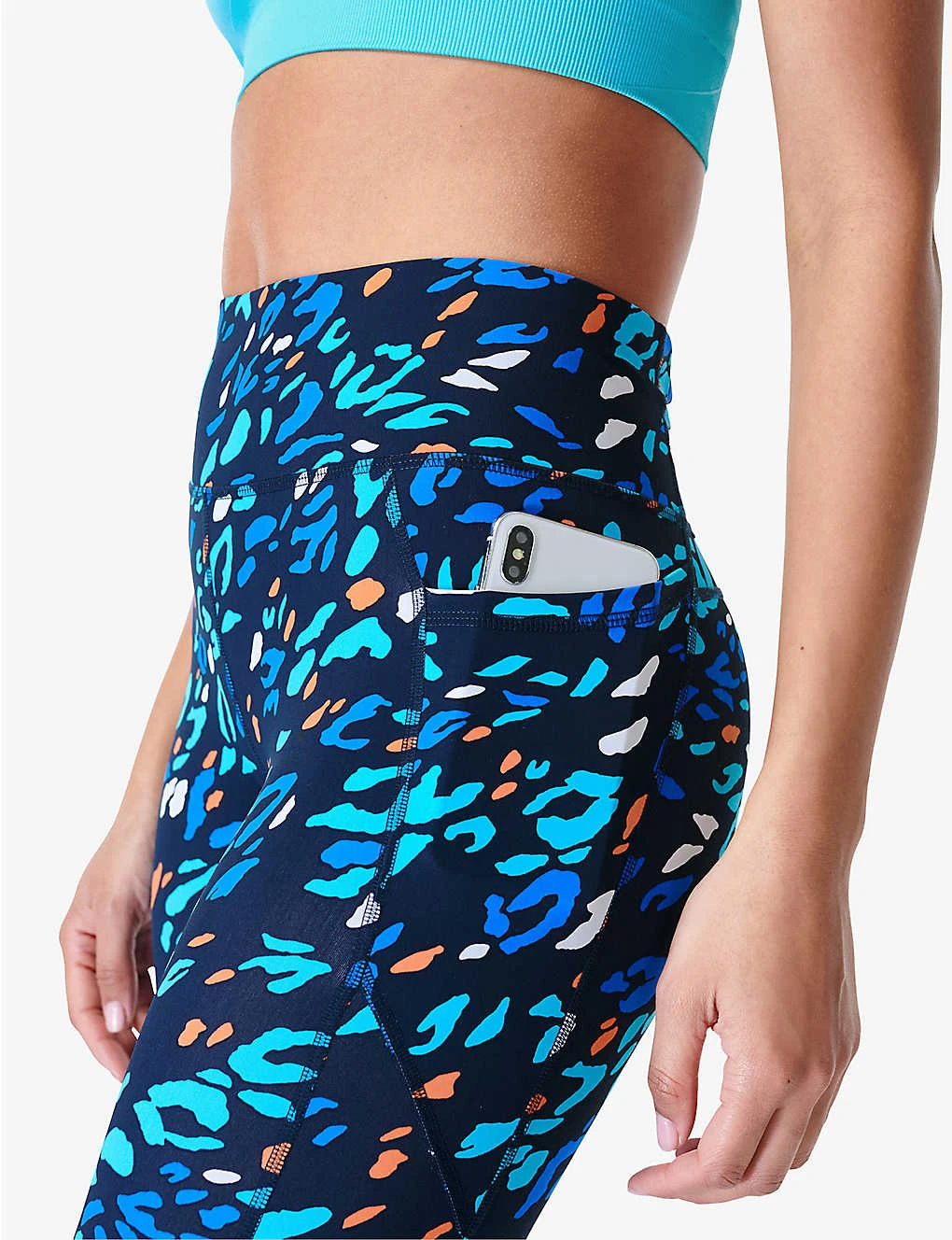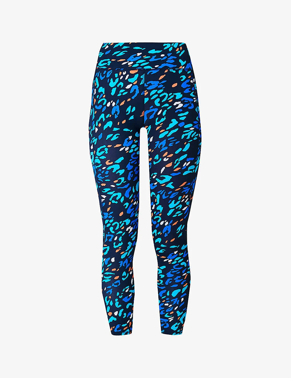 - Fitted, high rise, full-length leg, elasticated drawstring waistband, one slip pocket at side, one zipped pocket at back, moisture wicking, compression panels, 40+ UV protection, all-over print, signature brand print at back hem