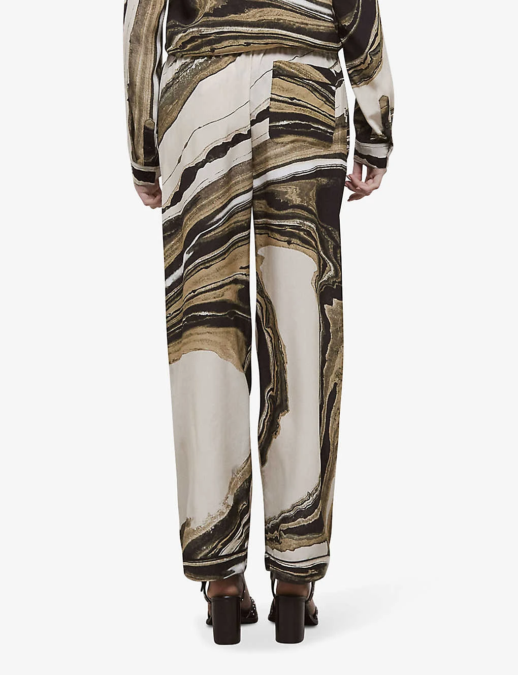 - Mid-rise, elasticated waistband, straight leg, all-over marbled print