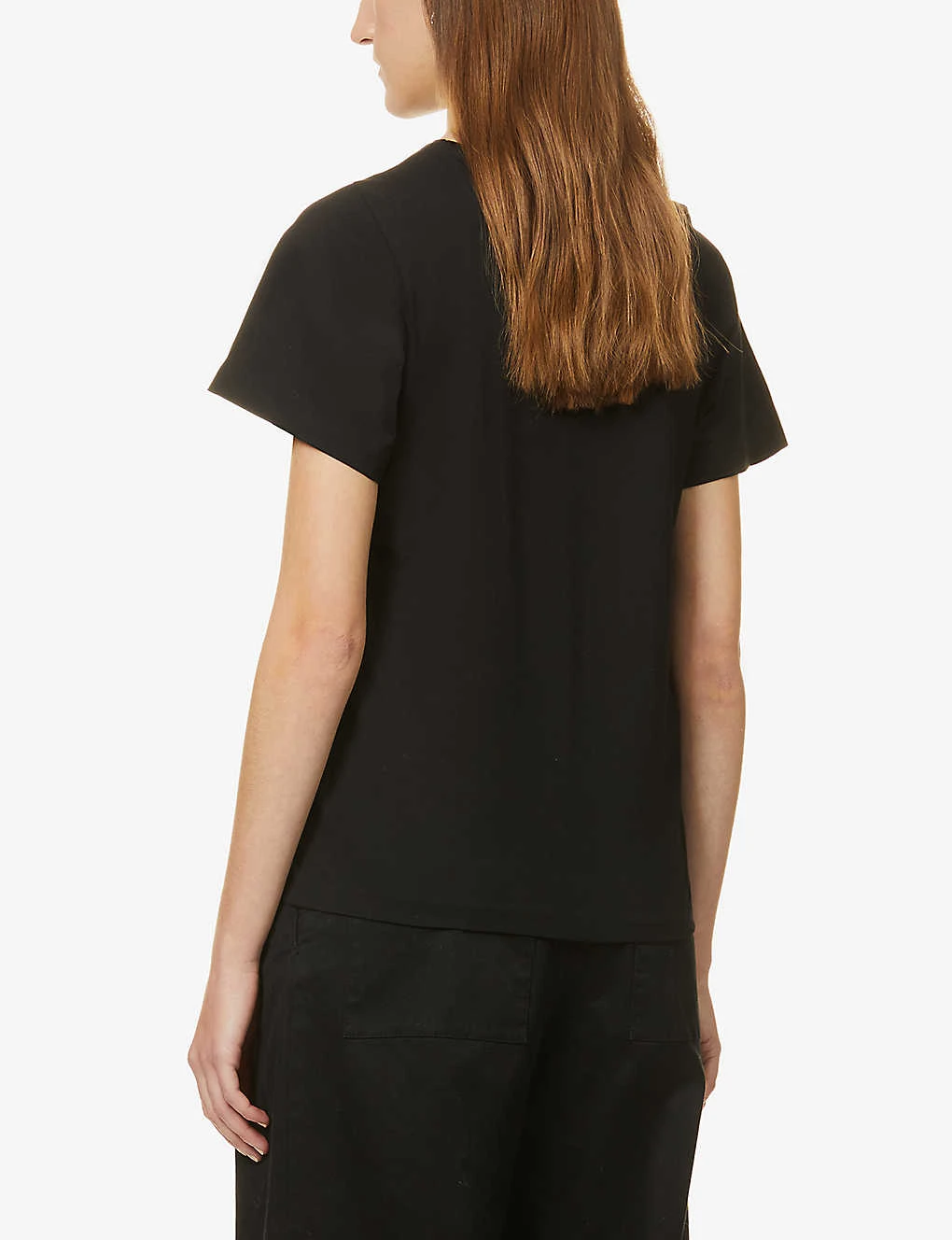 - Scoop neck, ribbed trim at neck, short sleeves, loose-fit, embroidered branding at front, tonal stitching