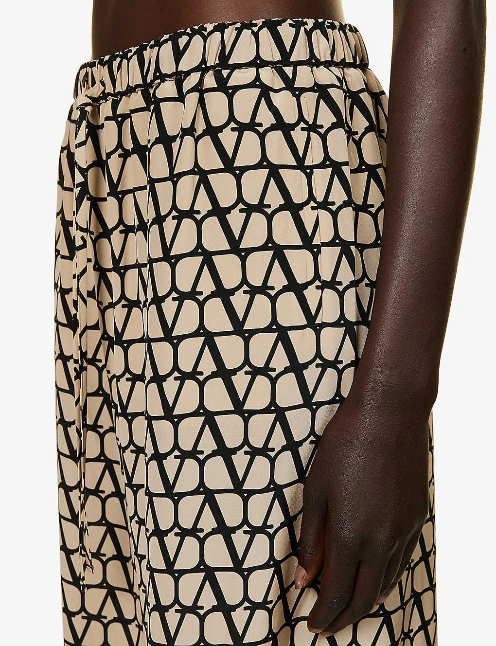 - Relaxed fit, mid-rise, wide leg, drawstring elasticated waistband, two slip pockets at front, all-over brand monogram pattern, unfinished hems – ready for tailoring