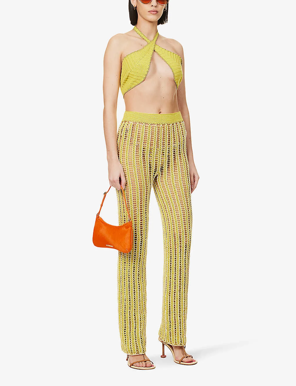- Regular-fit, high-rise, straight leg, elasticated waistband, all-over crochet knit and contrast stitching, semi-sheer panels