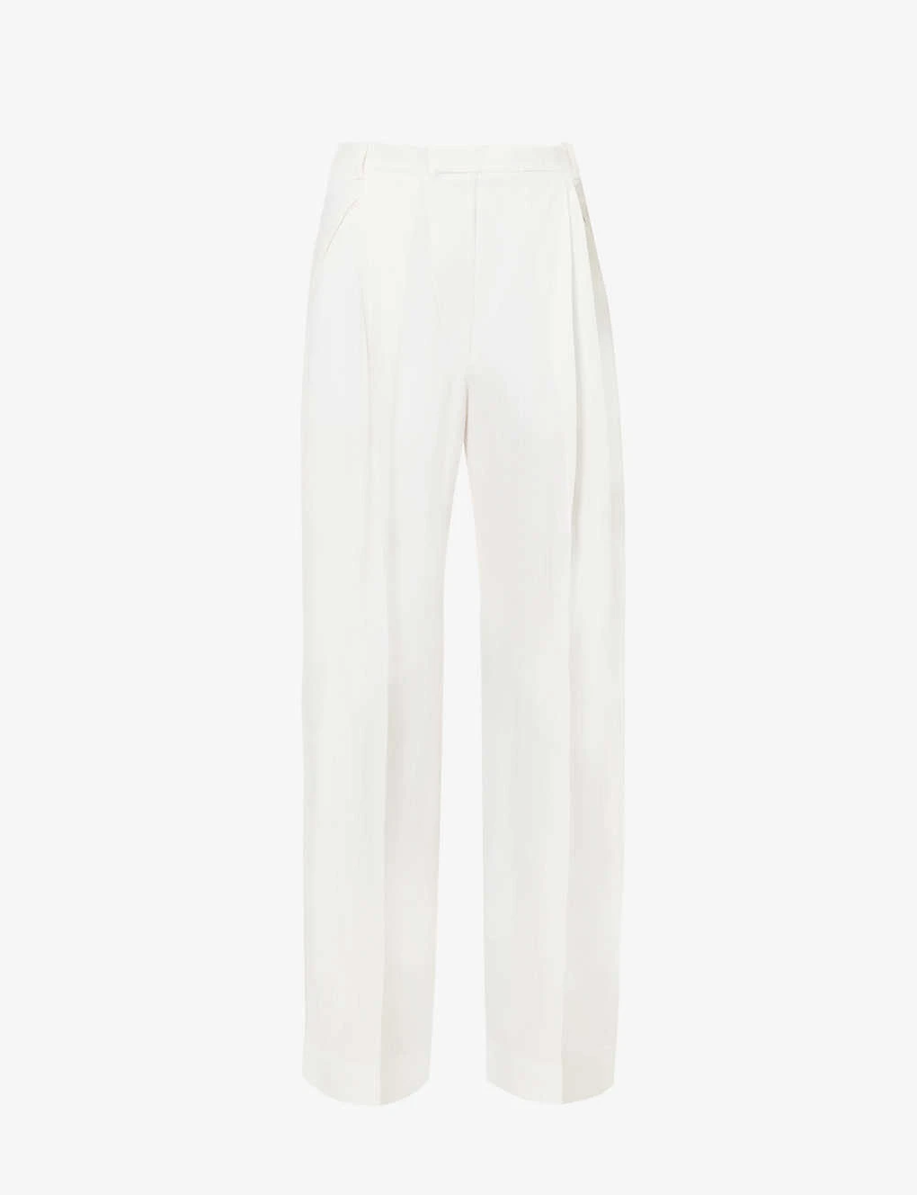 - Regular fit, mid-rise, wide leg, belt loops, pleats at front, two slip pockets at front, two welt pockets at back, pressed centre creases