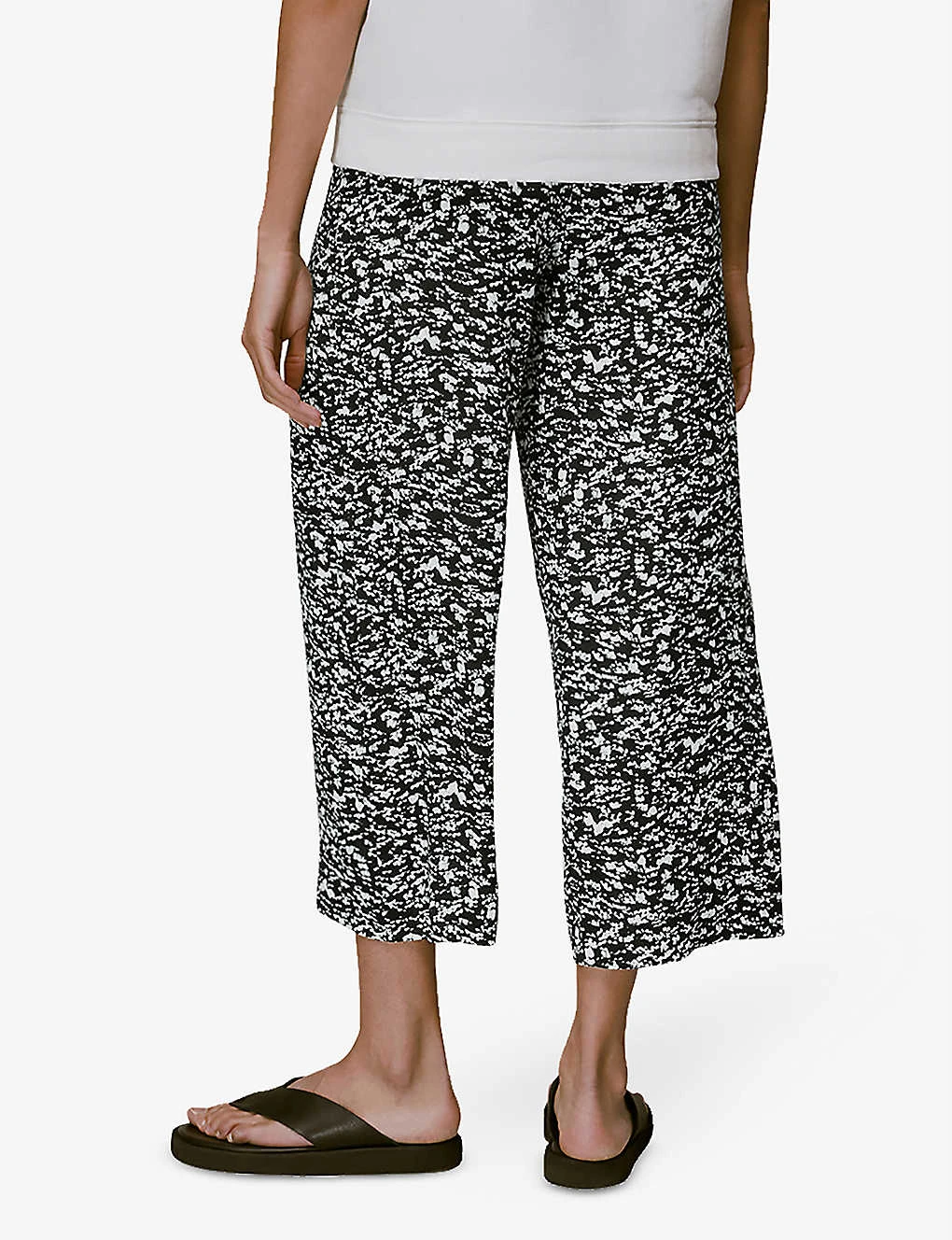 - Mid-rise, elasticated waistband, cropped length, wide leg, all-over graphic-print, relaxed fit