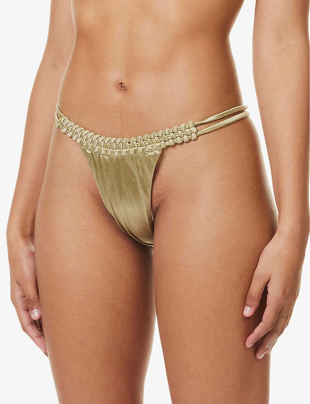 - Mid-rise, elasticated waistband, interwoven design at waistband, medium-coverage at back, fully lined